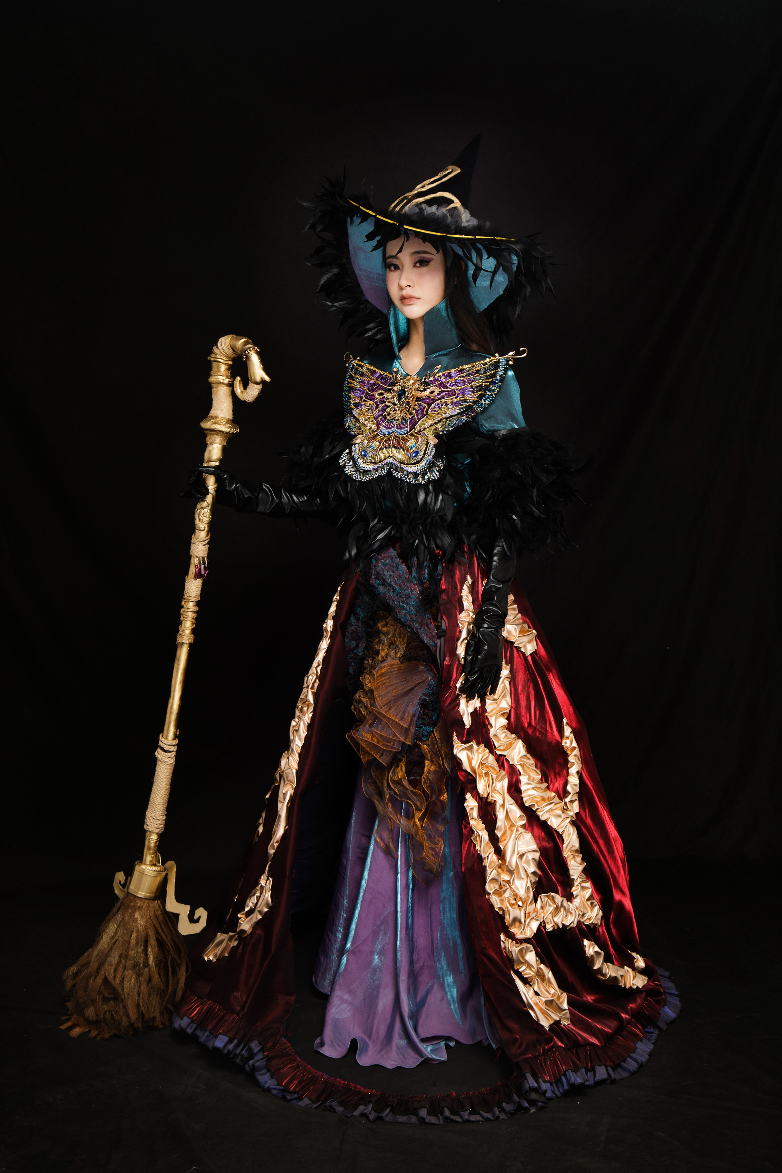 This is my undergraduate personal graduation project, it is not a performance project. I designed the costumes for the ten main characters and chose two of them for production. The two made costumes are divided into many parts: Elphaba's fishtail dress, chest decoration, bustle, outer skirt, wizard hat and cane; Dr. Goat's robe, cape, headdress, mask, and cane. The production of the costume part is mainly made by pattern cutting and draping on the stand.